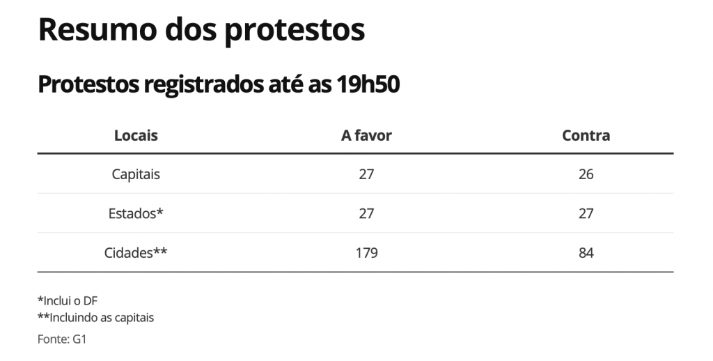 *Nesta matéria, falaremos dos protestos em apoio ao governo. Informações sobre os atos contrários e o panelaço estarão presentes em matéria individual, a seguir.